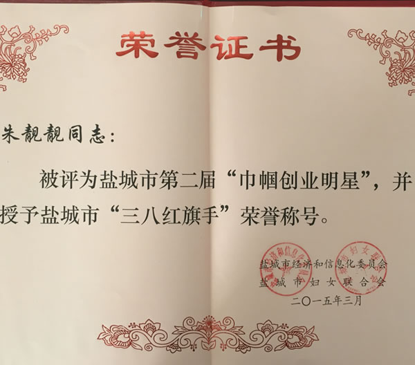 近日, 我公司朱靚靚同志被鹽城市經(jīng)濟和信息化委員會、鹽城市婦女聯(lián)合會評為鹽城市第二屆“巾幗創(chuàng)業(yè)明星”,并授予鹽城市“三八紅旗手”榮譽稱號。